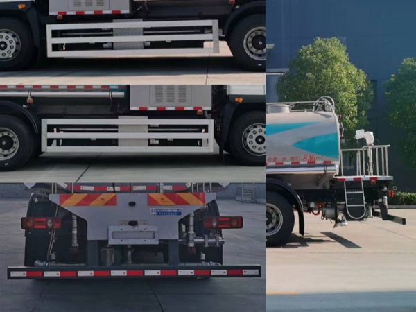 其它 | 1.該車裝備有罐體,噴水架等專用作業裝置,用于實現道路的清潔、灑水作業;2.罐體總容量8.56立方米,有效容積:8.16立方米,罐體外形尺寸(長×寬×高)mm:3600×2400×1440,運輸介質:水,密度1000千克/立方米;3.儲能裝置種類/單體生產企業/總成生產企業:磷酸鐵鋰蓄電池/寧德時代新能源科技股份有限公司/寧德時代新能源科技股份有限公司;4.驅動電機類型為永磁同步電機,額定功率為105kW,峰值功率為165kW;5.ABS型號/生產企業:CM4XL-4S/4M/廣州瑞立科密汽車電子股份有限公司;6.側防護材料:鋁合金,連接方式為螺栓連接;后防護材料:Q235,連接方式:螺栓連接,后防護斷面尺寸:60×120(mm),離地高度為430mm;7.該車選用4500mm軸距,整車長度(mm)/前伸(mm)/接近角(°)對應關系:9500/1000/6,9400/900/6,9100/600/11,8500/0/11,選裝前噴水架,前置電子水炮. | ||